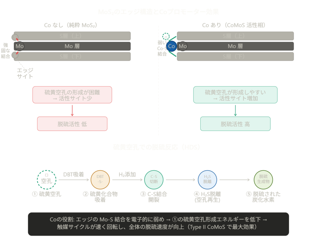 CoがMoS₂のエッジサイトに入り込み、Mo–S結合を電子的に弱めることで硫黄空孔が形成されやすくなります。この空孔が脱硫反応の活性サイトとなるため、Coは「空孔形成の促進剤」として機能し、脱硫速度を大幅に向上させます。